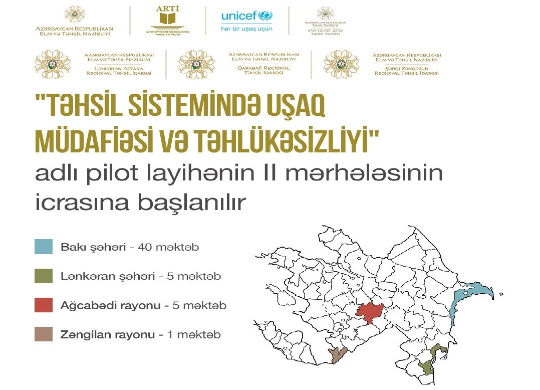 Azərbaycan Respublikası Elm və Təhsil Nazirliyi ilə BMT-nin Uşaq Fondunun (UNICEF) birgə fəaliyyət planı əsasında Təhsil İnstitutu Bakı Şəhəri üzrə Təhsil İdarəsi (BŞTİ), Lənkəran-Astara Regional Təhsil İdarəsi, Qarabağ Regional Təhsil İdarəsi və Şərqi Zəngəzur Regional Təhsil İdarəsi ilə birgə "Təhsil sistemində uşaq müdafiəsi və təhlükəsizliyi” pilot layihəsinin II mərhələsinin icrasına başlayır.